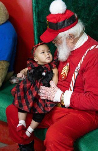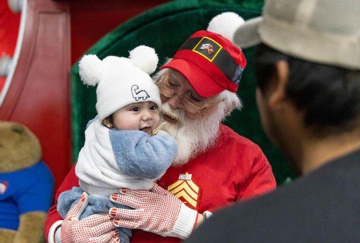Amazing Wolfe, 9 months, looks up at Marine Corps veteran Don Butler, dressed as Sgt. Claus, as she and her parents arrive to pick up their Toys for Tots bag of Christmas gifts at the “North Pole” in the Metals and More building off Veterans Memorial on the final distribution day for Warren County residents on Saturday, Dec. 20, 2025. More than 825 families total received gifts through Toys for Tots this year. (Grace McDowell)