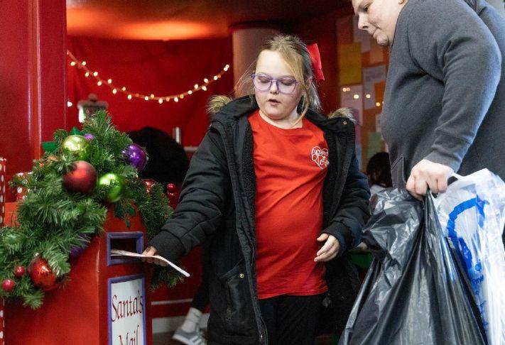 Aubrey Holland, 8, drops off her letter to Santa in Santa’s mailbox as she and her parents arrive to pick up their Toys for Tots bag of Christmas gifts at the “North Pole” in the Metals and More building off Veterans Memorial on the final distribution day for Warren County residents on Saturday, Dec. 20, 2025. More than 825 families total received gifts through Toys for Tots this year. (Grace McDowell)