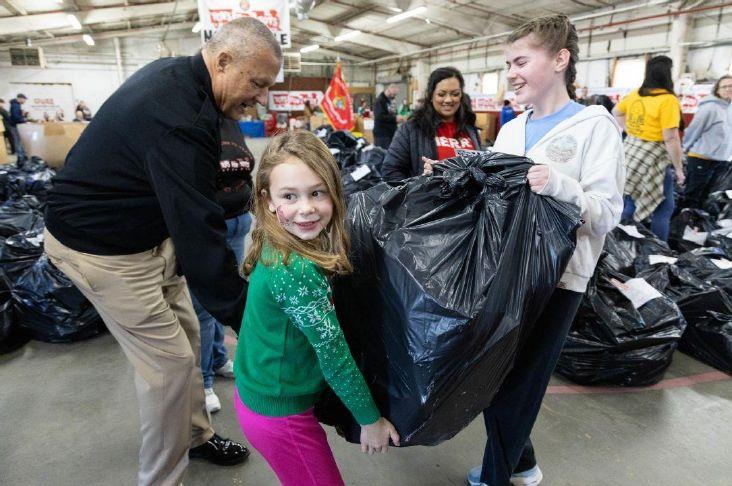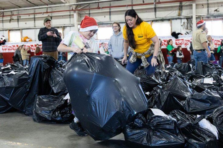 Emma Gomez, 7, and Margo Smith, 13, carry a large bag of Christmas toys as they volunteer to help distribute Toys for Tots bags of gifts to over 200 local families at the “North Pole” in the Metals and More building off Veterans Memorial on the final distribution day for Warren County residents on Saturday, Dec. 20, 2025. More than 825 families total received gifts through Toys for Tots this year. (Grace McDowell)