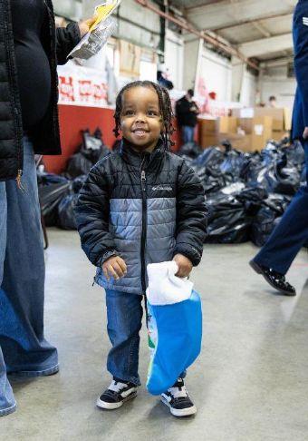 Osiris Lawson, 3, holds his stocking as he and his mother arrive to pick up their Toys for Tots bag of Christmas gifts at the “North Pole” in the Metals and More building off Veterans Memorial on the final distribution day for Warren County residents on Saturday, Dec. 20, 2025. More than 825 families total received gifts through Toys for Tots this year. (Grace McDowell)