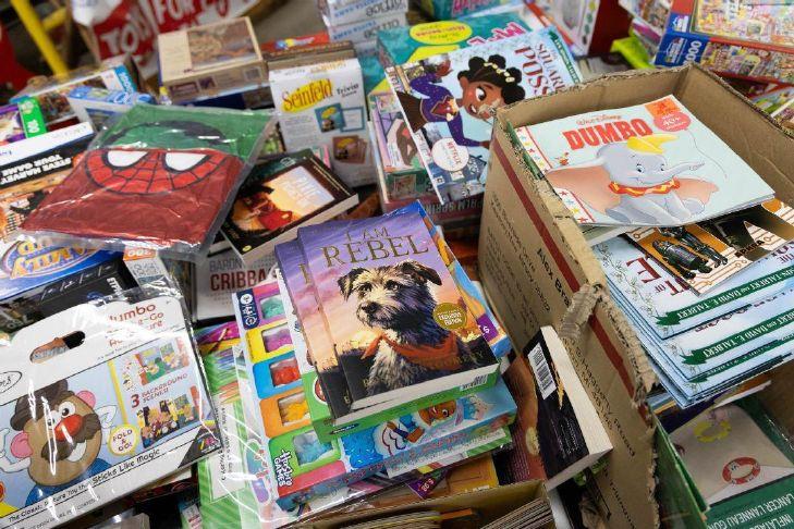 Stacks of books and toys are sorted by age groups as families arrive to pick up their Toys for Tots bags of Christmas gifts at the “North Pole” in the Metals and More building off Veterans Memorial on the final distribution day for Warren County residents on Saturday, Dec. 20, 2025. Over 825 families received gifts through Toys for Tots this year. (Grace McDowell)