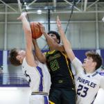 Bowling Green’s Hudson Aikins (15) shoots a layup as Greenwood’s Caden Graves (35) and Isaiah Summers (21) reach to block in the Gators’ 71-61 win over the Purples at Bowling Green High School on Friday, Jan. 9, 2026, for Greenwood’s first win against Bowling Green since 2022 and the first at BGHS since 2009. (GRACE McDOWELL / Bowling Green Daily News)