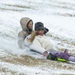 Anna Lange (left), 10, and her cousin Rose Johnson (right), 11, sled down Hospital Hill as snow falls around Bowling Green on Saturday, Jan. 24, 2026. (GRACE McDOWELL / The Daily News)