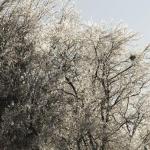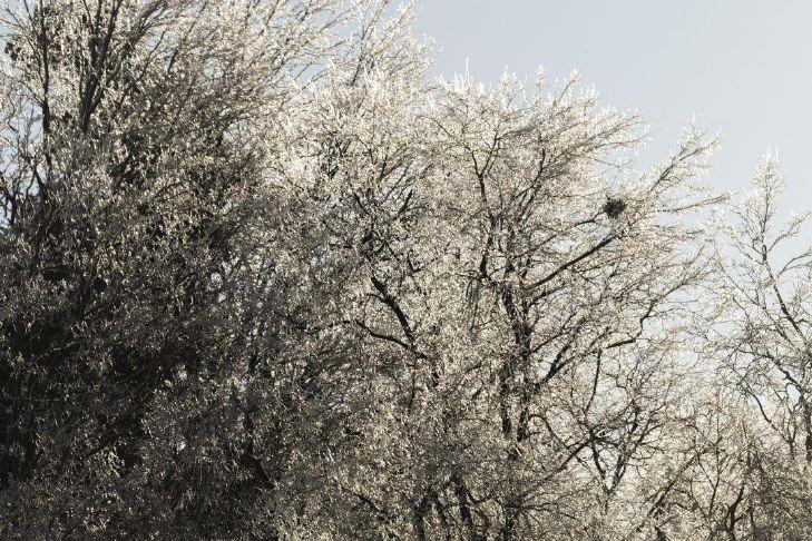 The ice that has collected in between snowfalls, however, has had the effect of packing the snow on the ground tightly in place while weighing down branches and power lines.