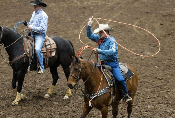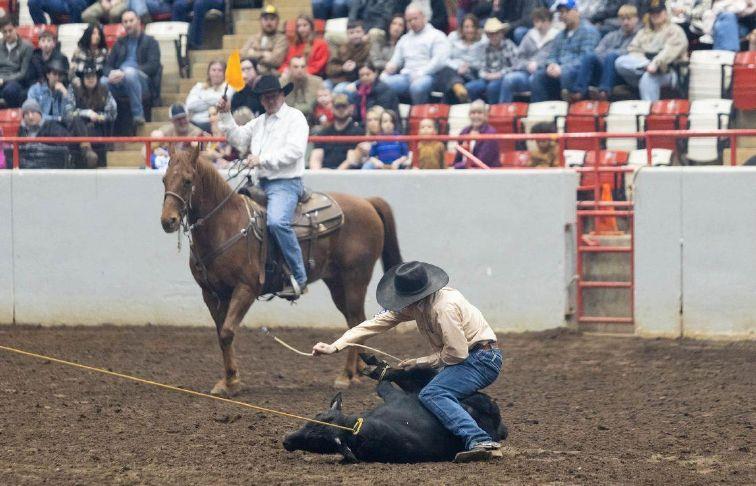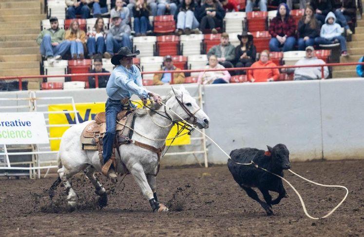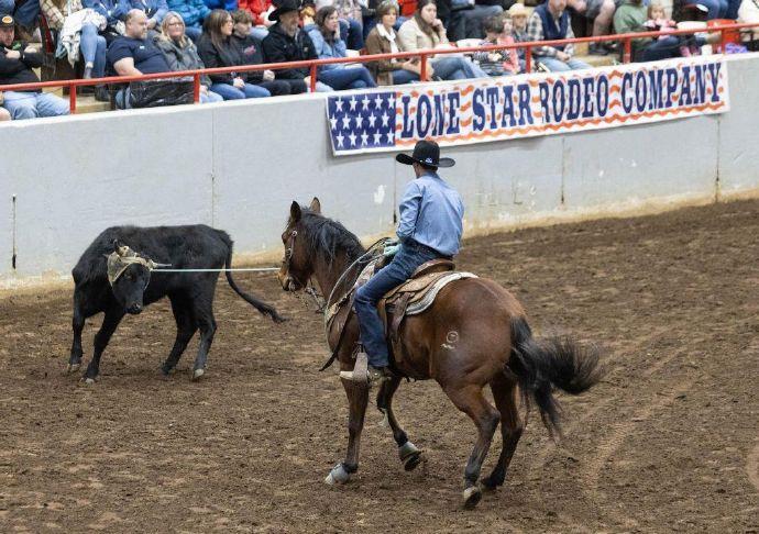 Cy Webb of Byrdstown, Tenn., competes in the calf roping event at the 44th annual Lone Star Championship Rodeo at the L.D. Brown Agricultural Exposition Center on Friday night, Feb. 13, 2026. The rodeo continues throughout the weekend with shows on Saturday at 2 and 8 p.m. and on Sunday at 2 p.m. (GRACE McDOWELL / The Daily News)