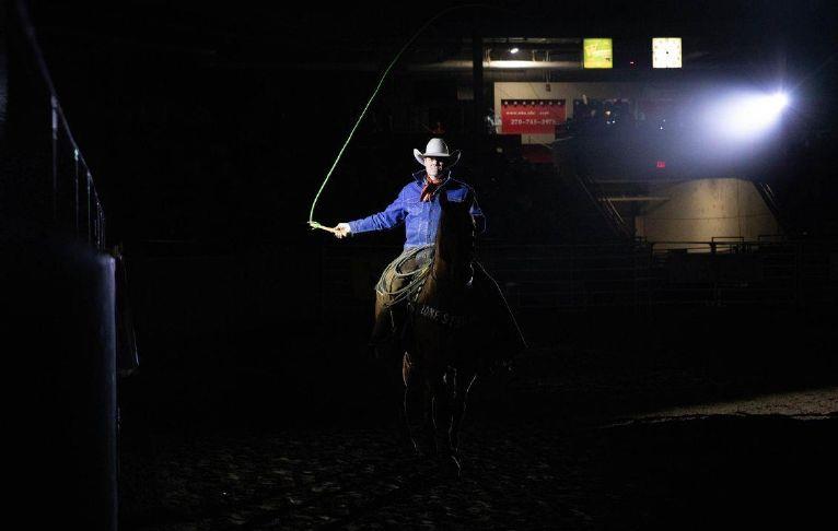 Clint Madison of Crofton rides around the arena on his horse while cracking a whip during the 44th annual Lone Star Championship Rodeo at the L.D. Brown Agricultural Exposition Center on Friday night, Feb. 13, 2026. The rodeo continues throughout the weekend with shows on Saturday at 2 and 8 p.m. and on Sunday at 2 p.m. (GRACE McDOWELL / The Daily News)