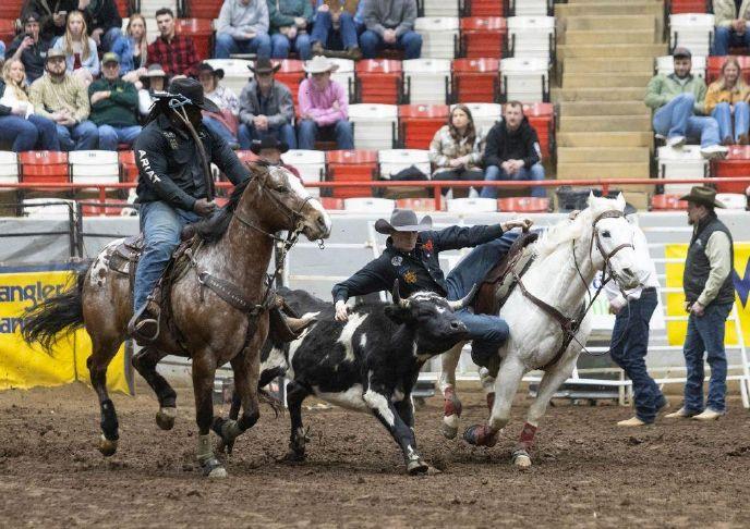Hunter Wylie of Saint Johns, Mich., competes in the steer wrestling event at the 44th annual Lone Star Championship Rodeo at the L.D. Brown Agricultural Exposition Center on Friday night, Feb. 13, 2026. The rodeo continues throughout the weekend with shows on Saturday at 2 and 8 p.m. and on Sunday at 2 p.m. (GRACE McDOWELL / The Daily News)