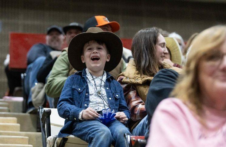 Jack White, 7, of Bowling Green laughs at jokes made by Rodeo Clown Mike Wentworth at the 44th annual Lone Star Championship Rodeo at the L.D. Brown Agricultural Exposition Center on Friday night, Feb. 13, 2026. The rodeo continues throughout the weekend with shows on Saturday at 2 and 8 p.m. and on Sunday at 2 p.m. (GRACE McDOWELL / The Daily News)