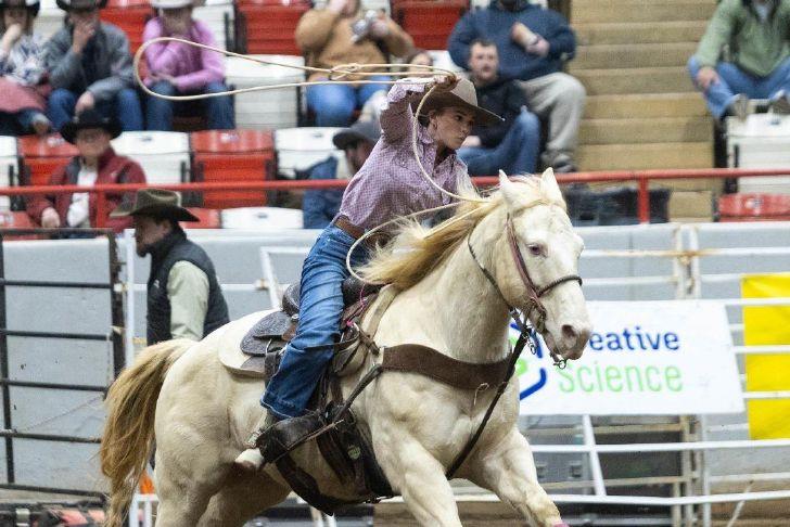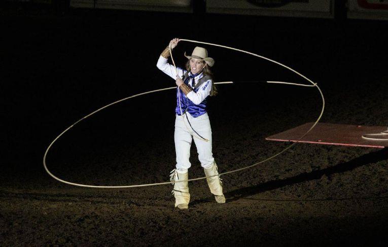 Lindsey Wentworth spins 55 feet of rope while performing stunts at the 44th annual Lone Star Championship Rodeo at the L.D. Brown Agricultural Exposition Center on Friday night, Feb. 13, 2026. The rodeo continues throughout the weekend with shows on Saturday at 2 and 8 p.m. and on Sunday at 2 p.m. (GRACE McDOWELL / The Daily News)