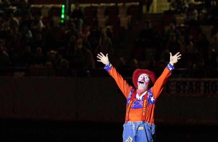 Rodeo clown Mike Wentworth gets the crowd to cheer during the 44th annual Lone Star Championship Rodeo at the L.D. Brown Agricultural Exposition Center on Friday night, Feb. 13, 2026. The rodeo continues throughout the weekend with shows on Saturday at 2 and 8 p.m. and on Sunday at 2 p.m. (GRACE McDOWELL / The Daily News)