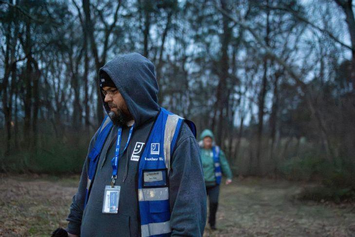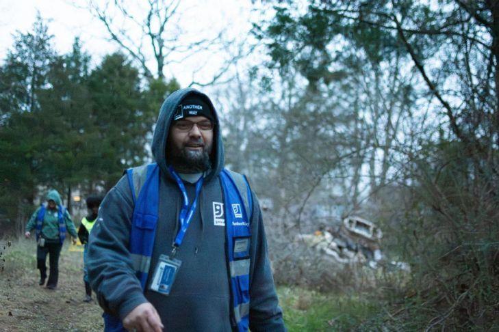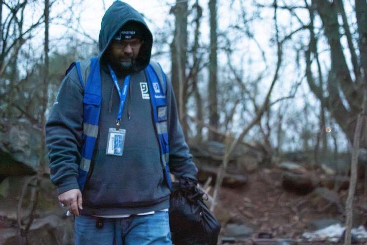 Off a beaten path by Lampkin Park, a low-hanging branch obstructs woody shrubland, where two nonprofit operators traverse brush in search of unhoused locals. A clearing turns up a baby carriage, two carts and other belongings as the rain picks up, and Goodwill Outreach Specialist Kristopher York calls for anyone there — but any residents had vacated, their mattress and the rest now drenched in the mud.