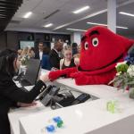 Big Red hands a slip to Fifth Third Bank employee Angel Nguyen following a ribbon cutting ceremony for the bank’s first ever location in Bowling Green on Thursday. (JACK DOBBS / Daily News)