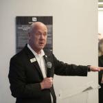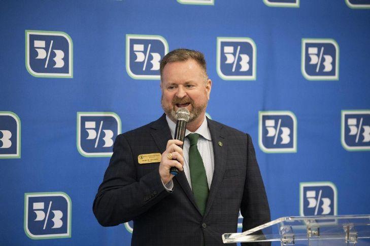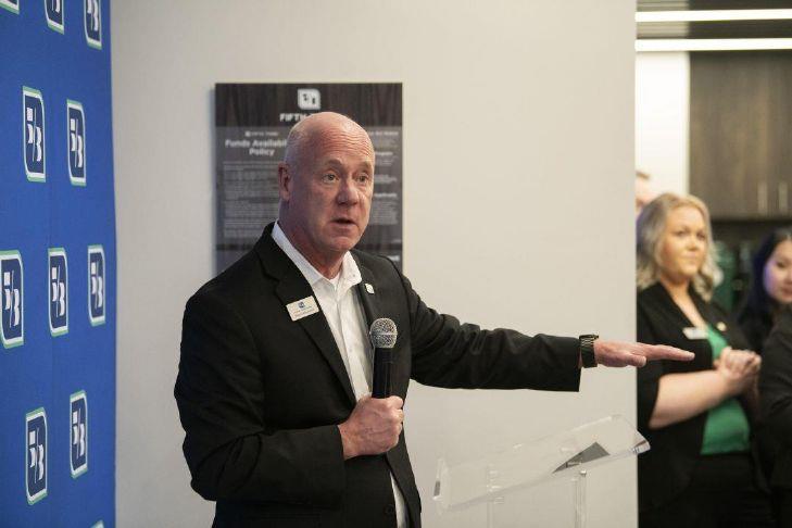 Steve Helmecamp, regional retail for Fifth Third Bank, addresses a crowd of bank personnel, representatives from the Bowling Green Area Chamber of Commerce and local officials during a ribbon cutting ceremony for the bank’s first ever location in Bowling Green on Thursday. (JACK DOBBS / Daily News)
