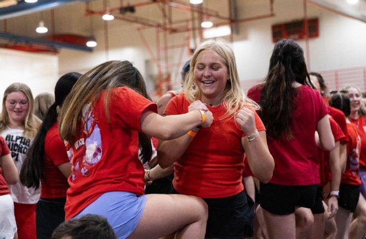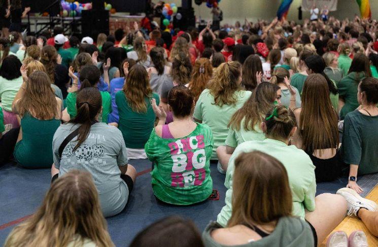 Western Kentucky University students learn the first section of the group dance during the 12th annual Dance Big Red dance marathon benefiting Norton Children’s Hospital in WKU’s Raymond B. Preston Health & Activities Center on Friday, March 6, 2026. The WKU students raised $141,555.32 for pediatric cardiovascular services and pediatric cancer care at Norton Children’s Hospital. (Grace McDowell / The Daily News)