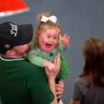 Lainey Brennan, 1, squeals as her father Jonathan holds her while her parents share her story of receiving open heart surgery and medical care at Norton Children’s Hospital during the 12th annual Dance Big Red dance marathon benefiting Norton Children’s Hospital in Western Kentucky University’s Raymond B. Preston Health & Activities Center on Friday, March 6, 2026. The WKU students raised $141,555.32 for pediatric cardiovascular services and pediatric cancer care at Norton Children’s Hospital. (Grace McDowell / The Daily News)