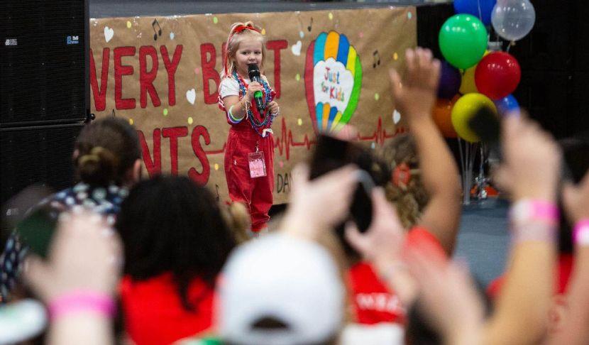 Magnolia Ford, who has undergone two open-heart surgeries and received treatment from Norton Children’s Hospital, sings “Let It Go” from the Disney movie “Frozen” for Western Kentucky University students during the 12th annual Dance Big Red dance marathon benefiting Norton Children’s Hospital in the Raymond B. Preston Health & Activities Center on Friday, March 6, 2026. The WKU students raised $141,555.32 for pediatric cardiovascular services and pediatric cancer care at Norton Children’s Hospital. (Grace McDowell / The Daily News)