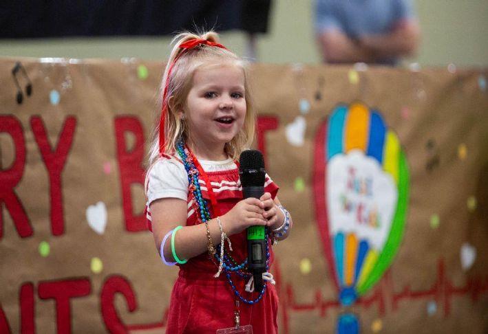 Magnolia Ford, who has undergone two open-heart surgeries and received treatment from Norton Children’s Hospital, sings “Let It Go” from the Disney movie “Frozen” as Western Kentucky University students wave flashlights on their phones during the 12th annual Dance Big Red dance marathon benefiting Norton Children’s Hospital in the Raymond B. Preston Health & Activities Center on Friday, March 6, 2026. The WKU students raised $141,555.32 for pediatric cardiovascular services and pediatric cancer care at Norton Children’s Hospital. (Grace McDowell / The Daily News)