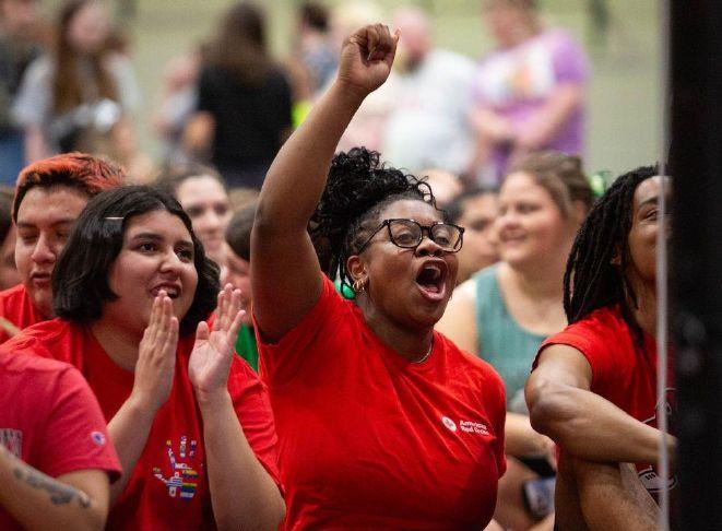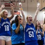 Western Kentucky University students on the Blue Team cheer as their superhero kid, Graycyn Poland, 11, from Scottsville, arrives for the 12th annual Dance Big Red dance marathon benefiting Norton Children’s Hospital in WKU’s Raymond B. Preston Health & Activities Center on Friday, March 6, 2026. The WKU students raised $141,555.32 for pediatric cardiovascular services and pediatric cancer care at Norton Children’s Hospital. (Grace McDowell / The Daily News)