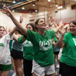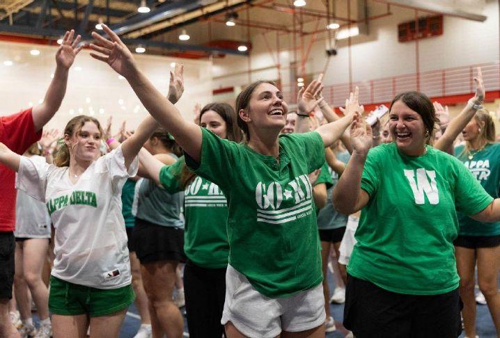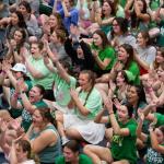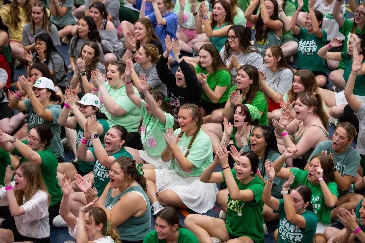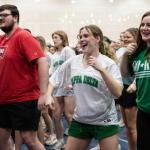Western Kentucky University students on the Green Team cheer for their superhero kid, Lainey Brennan, as her parents share her story of receiving open heart surgery and medical care at Norton Children’s Hospital during the 12th annual Dance Big Red dance marathon benefiting Norton Children’s Hospital in WKU’s Raymond B. Preston Health & Activities Center on Friday, March 6, 2026. The WKU students raised $141,555.32 for pediatric cardiovascular services and pediatric cancer care at Norton Children’s Hospital. (Grace McDowell / The Daily News)